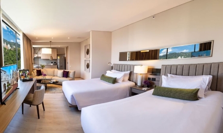 Este amplio apartamento de 44m² cuenta con una habitación con dos camas, un baño, ropa de cama de lujo con sábanas de 400 hilos, amenidades de L’Occitane, una sala de estar, una cocina completa y un televisor 4K con DirecTV.