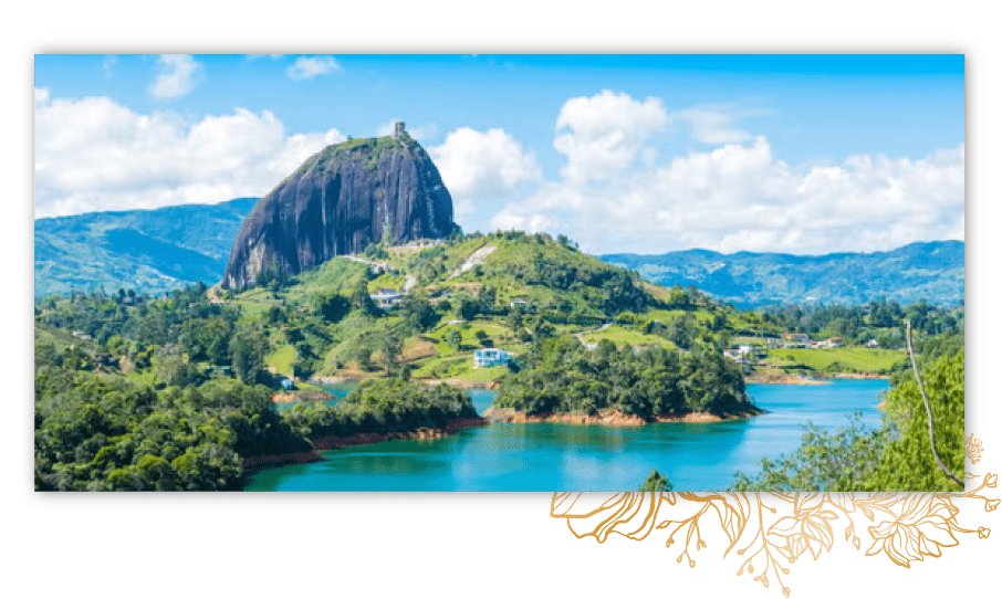 Tal vez uno de los lugares más visitados en todo Colombia. Guatapé es naturaleza, cultura y color. Es una experiencia única que te lleva a admirar el arte en cada zócalo plasmado en el pueblo, observar los habitantes de la zona, probar un café colombiano y apoyar la economía local. El lugar perfecto para conectarse con la naturaleza, cultura y diversión. Evento exclusivo para todos los invitados, con excepción de la corte nupcial y familia cercana.